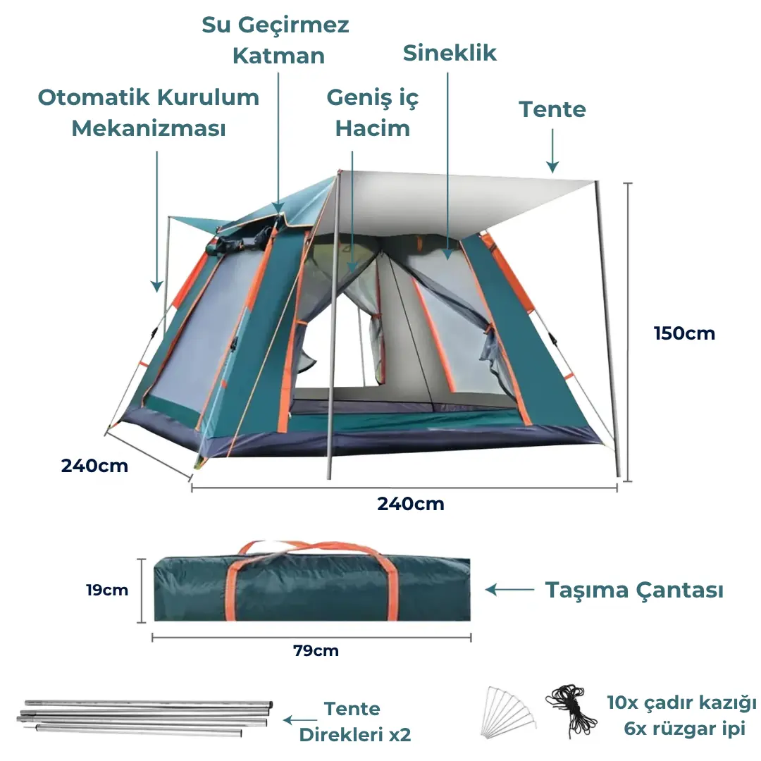 - Paket İçeriği: 1 taşıma çantası, 10 çadır kazığı, 6 rüzgar ipi, 2 tente direği, otomatik kamp çadırı